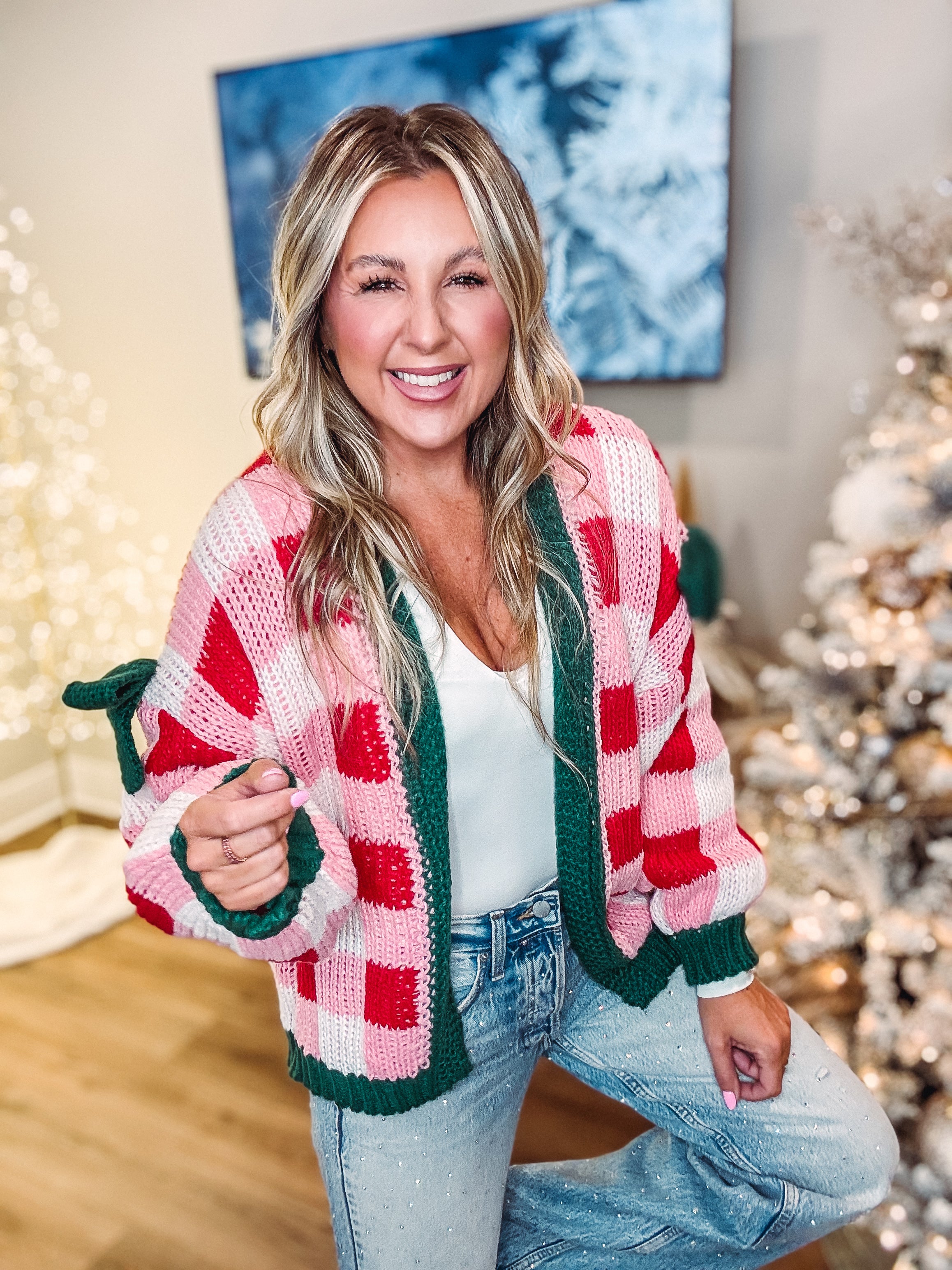 This Cardigan features an open front design and long sleeves, offering a comfortable fit. Its waist-length cut and classic gingham print make it an easy layering piece for any casual outfit.