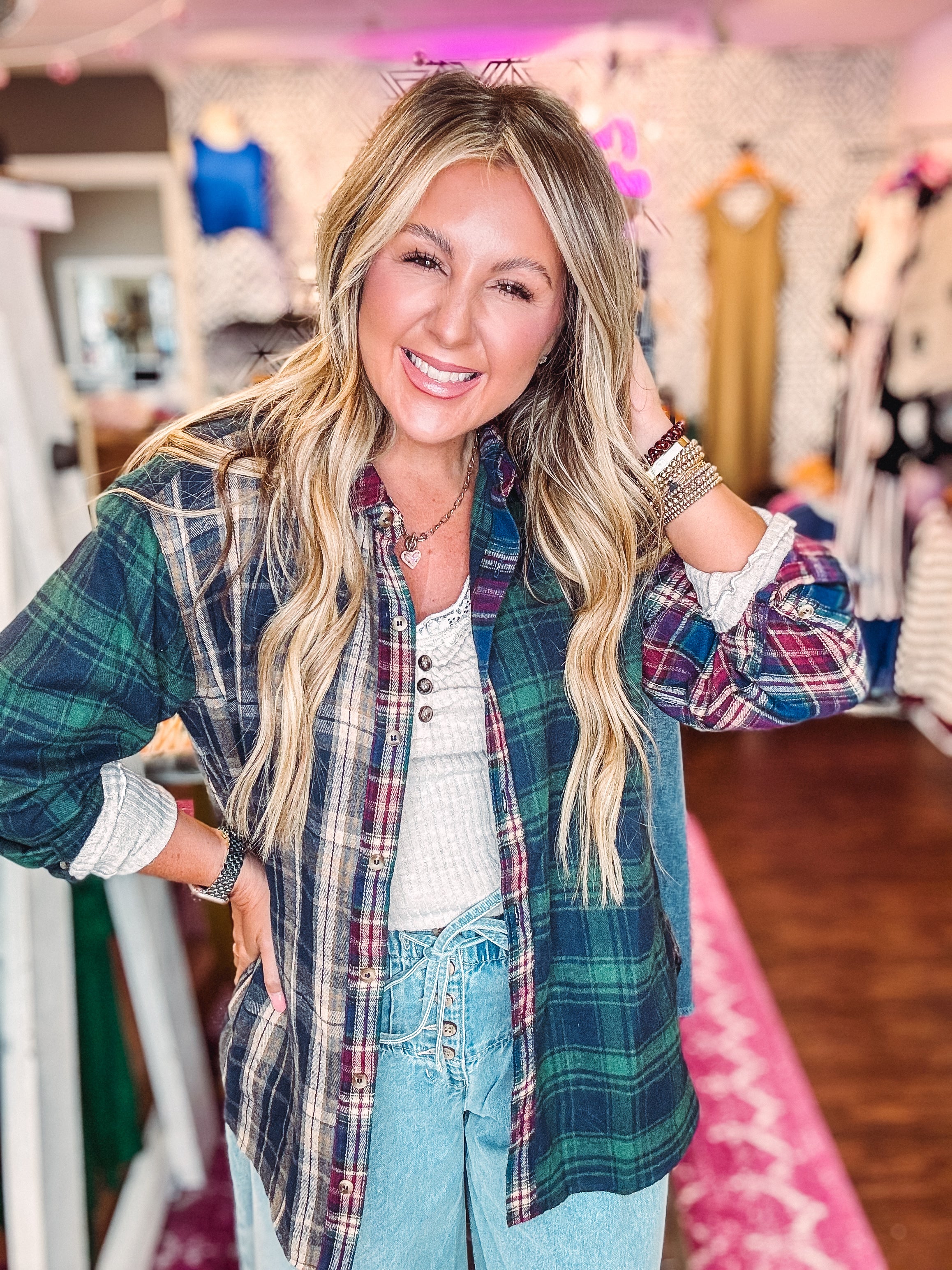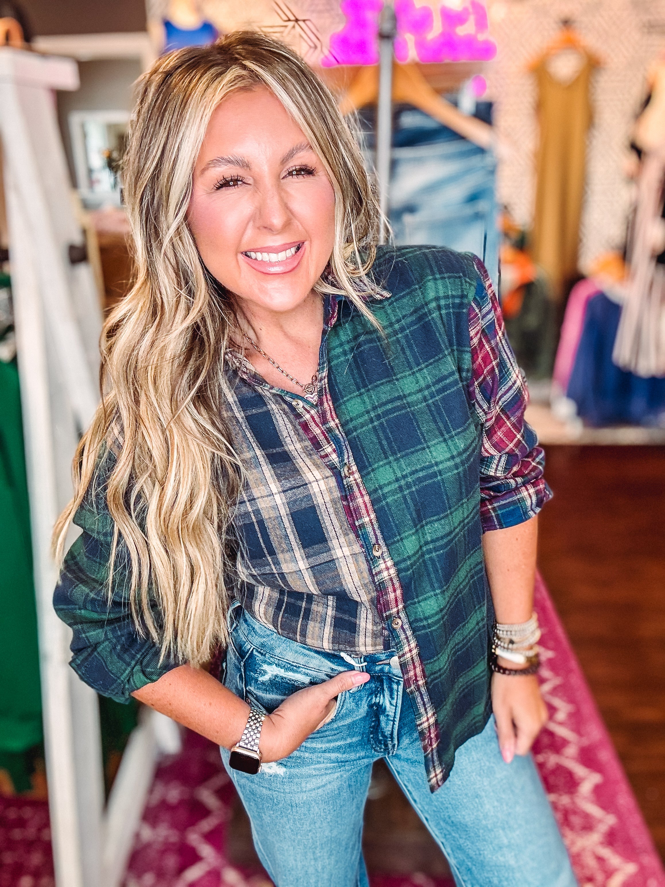 "Spice up your wardrobe with this mixed plaid button down shirt. The perfect blend of fun and fashion, this shirt is sure to turn heads. Get ready to rock your unique style with this playful and stylish top! (Limited quantities available, so grab yours now!)"