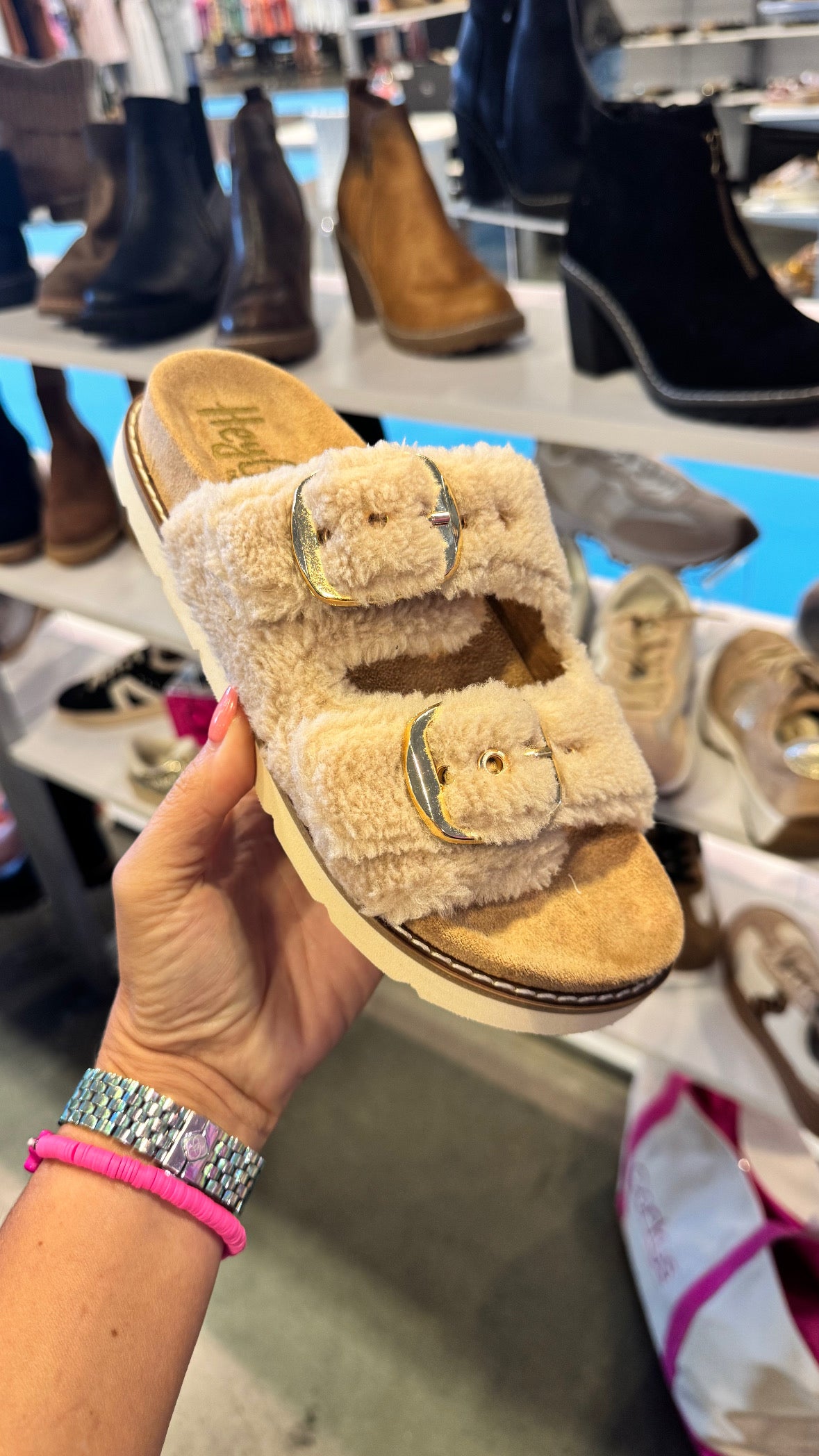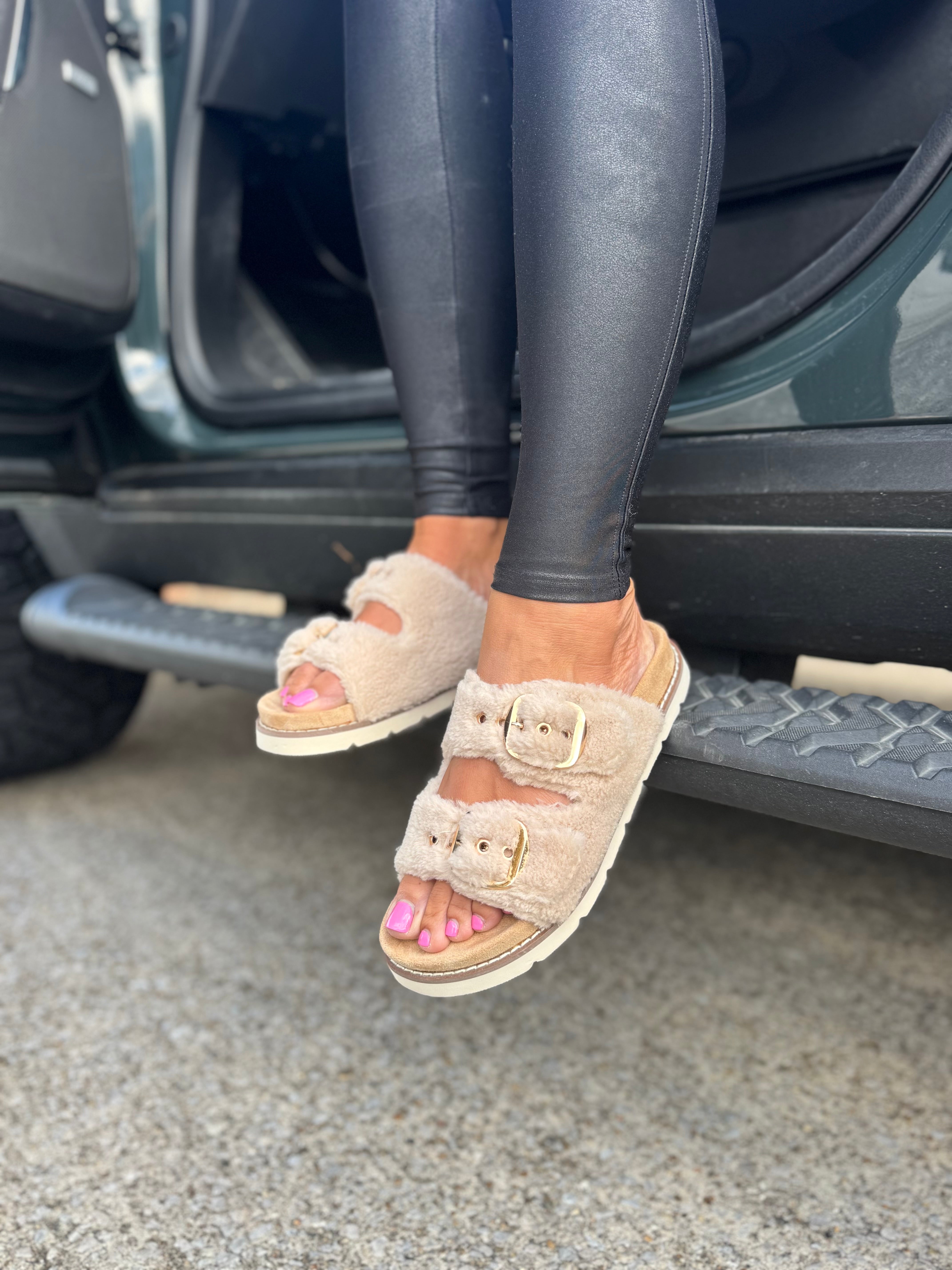 Get cozy with Feelin Saucy—a fuzzy double-strap slide with gold buckles and a cushioned footbed that brings sass and softness to your everyday lounge look.