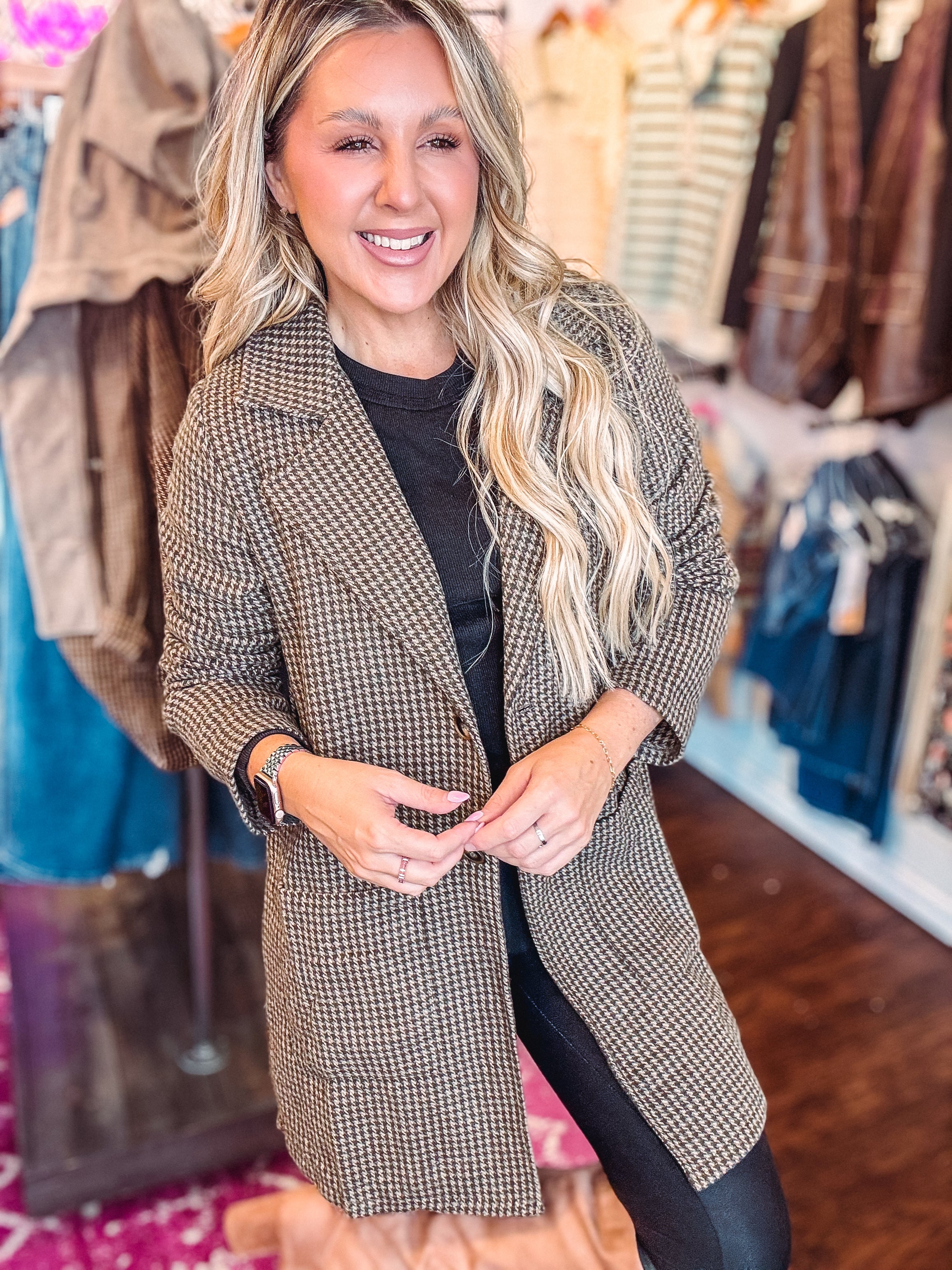 Meet your new go-to layering piece! This stylish mid-length jacket features dark green and cream houndstooth pattern that instantly elevates any outfit. Designed with a built-in layered look, it includes a soft, zip-up knit hoodie insert that can be easily removed for ultimate versatility. Wear it with the hoodie for a casual, laid-back vibe—or detach it for a more polished, classic finish.