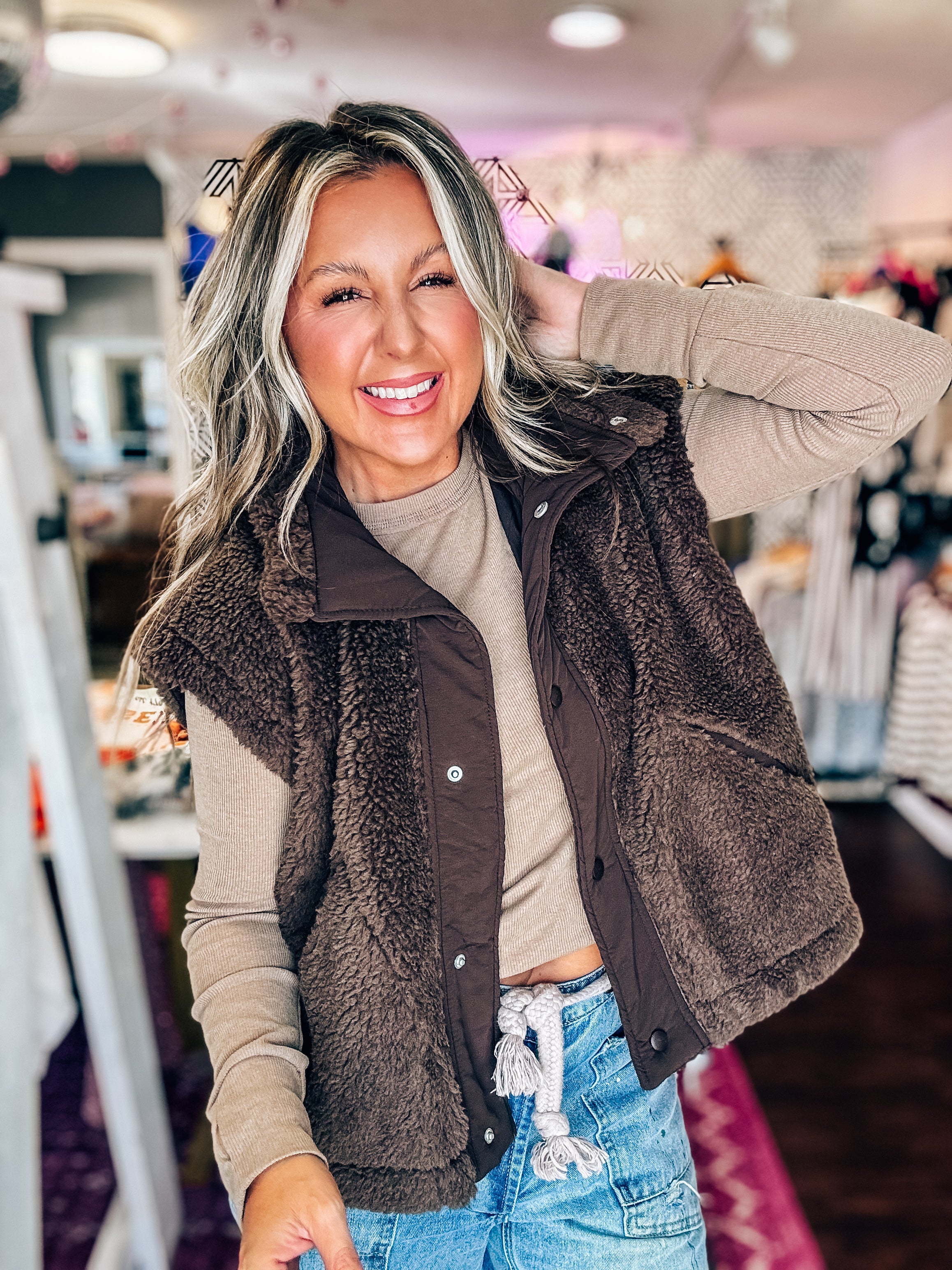 Cozy Mock Neck Sherpa Vest Jacket - Brown