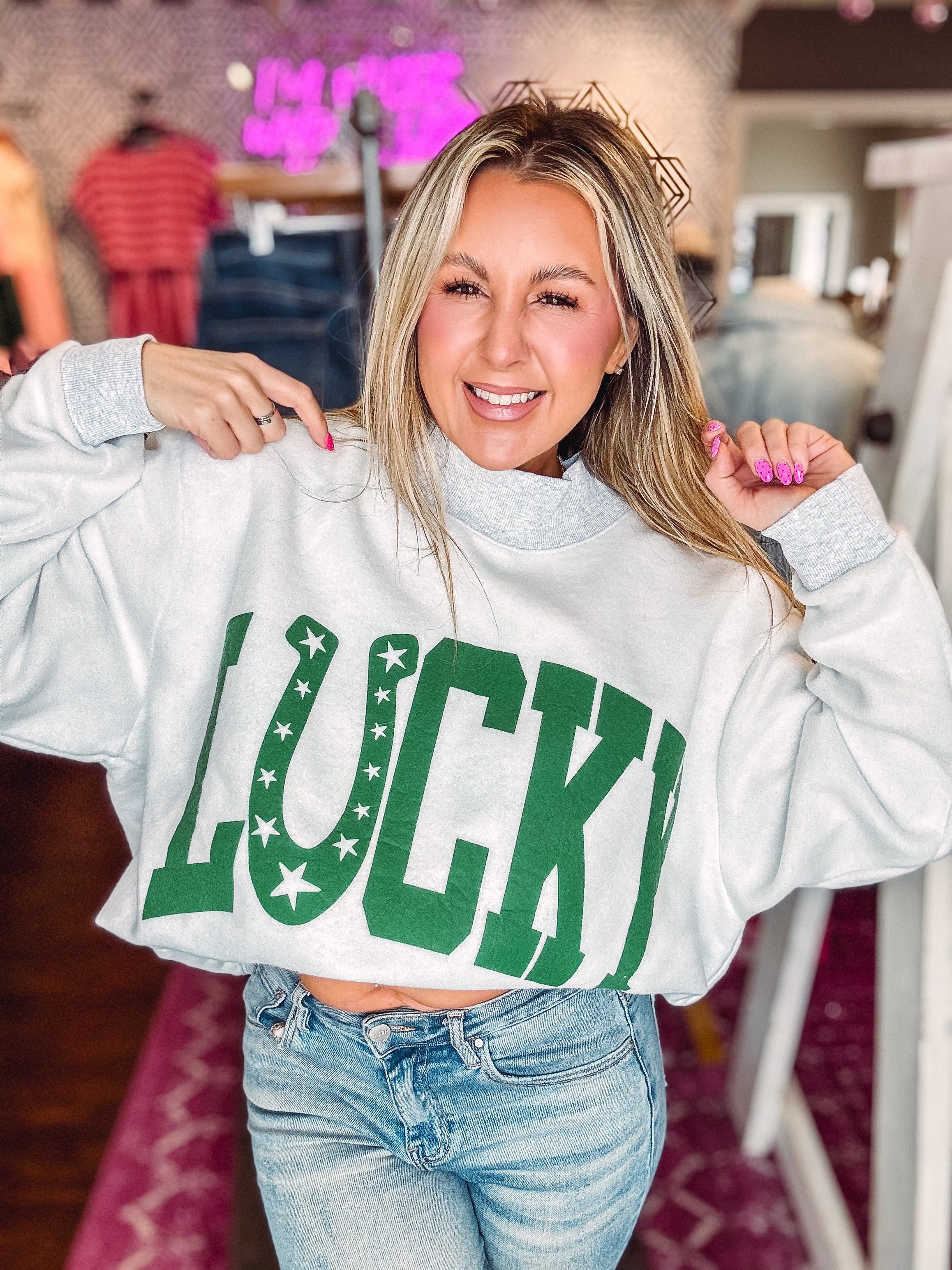 Feeling extra lucky? You will in this ultra-cozy, statement-making sweatshirt! Our Lucky Mock Neck Reversible Sweatshirt gives you two looks in one — making it the perfect grab-and-go piece for St. Patrick’s Day and beyond.