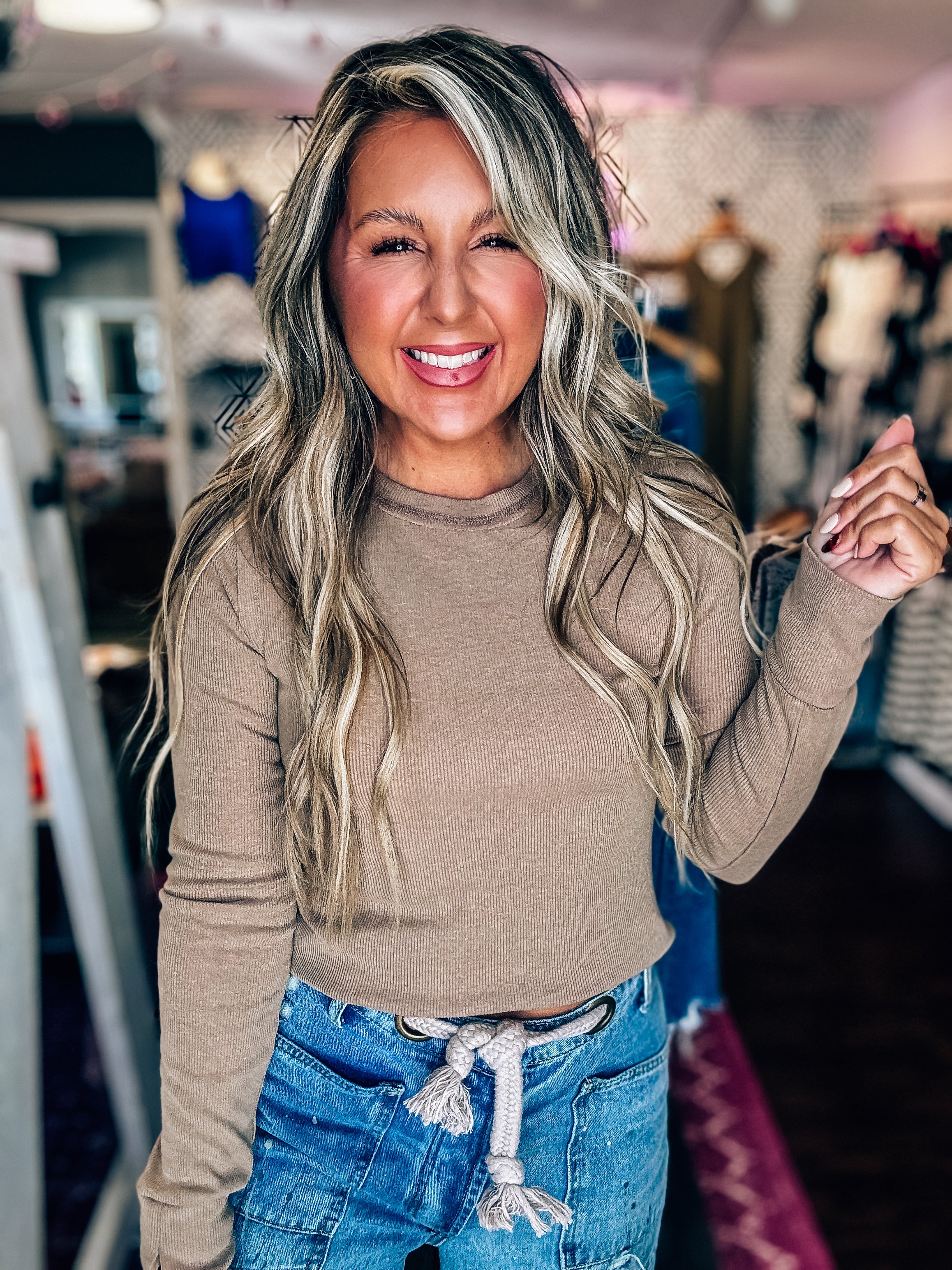Experience elevated comfort with this long-sleeve top featuring a mineral garment wash that enhances its uniqueness. Its fitted silhouette makes it perfect for layering or as a stylish standalone piece. This top seamlessly transitions from day-to-night wear, making it a versatile addition to your wardrobe. Pair with high-waisted trousers or skirts for a polished look and accessorize with a bold necklace or drop earrings for evening outings.
