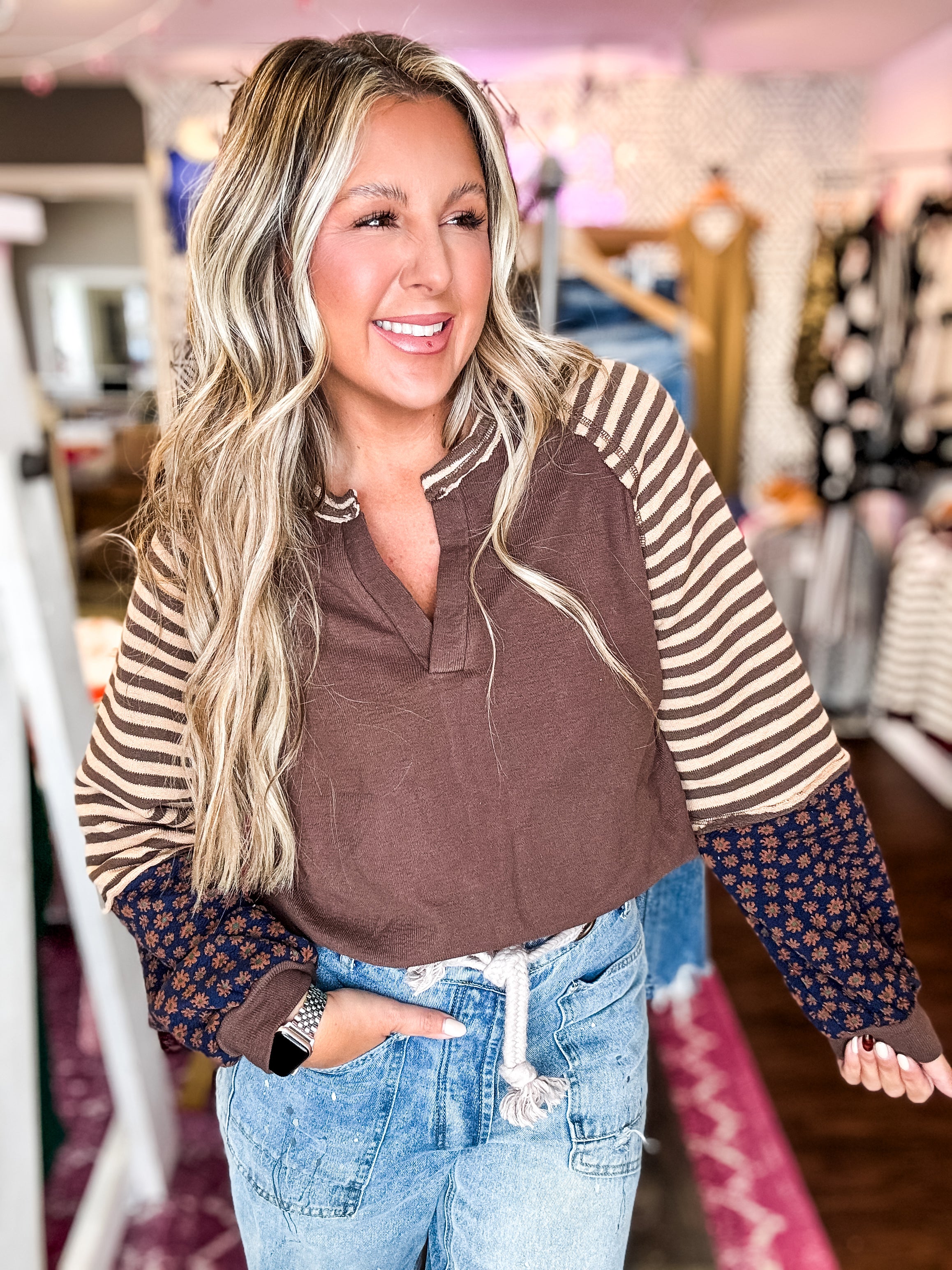 Oversized Floral & Stripe Casual Knit Top - Mocha