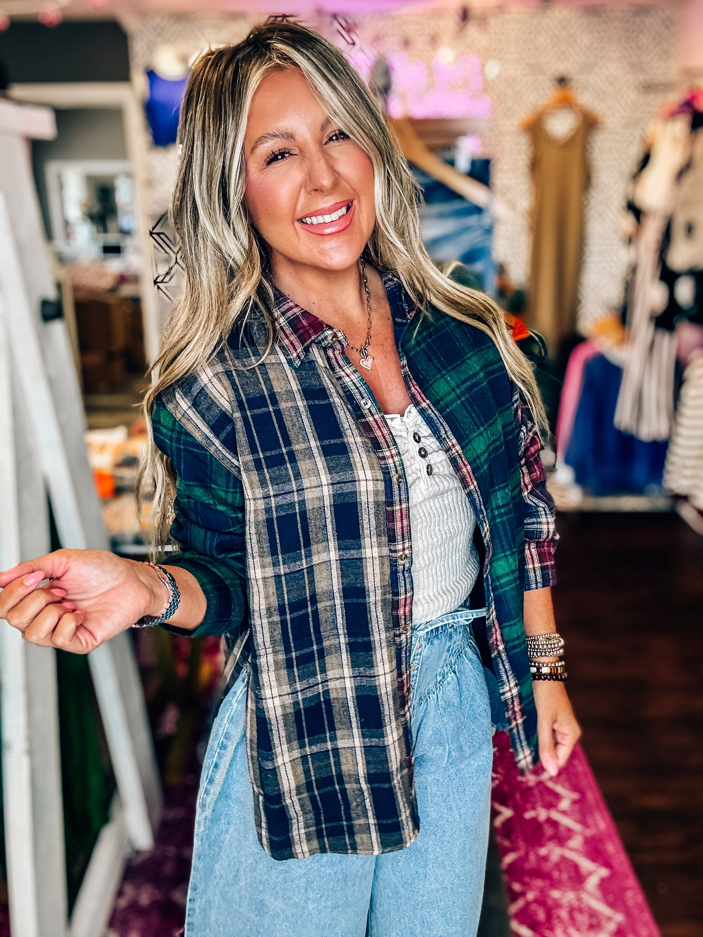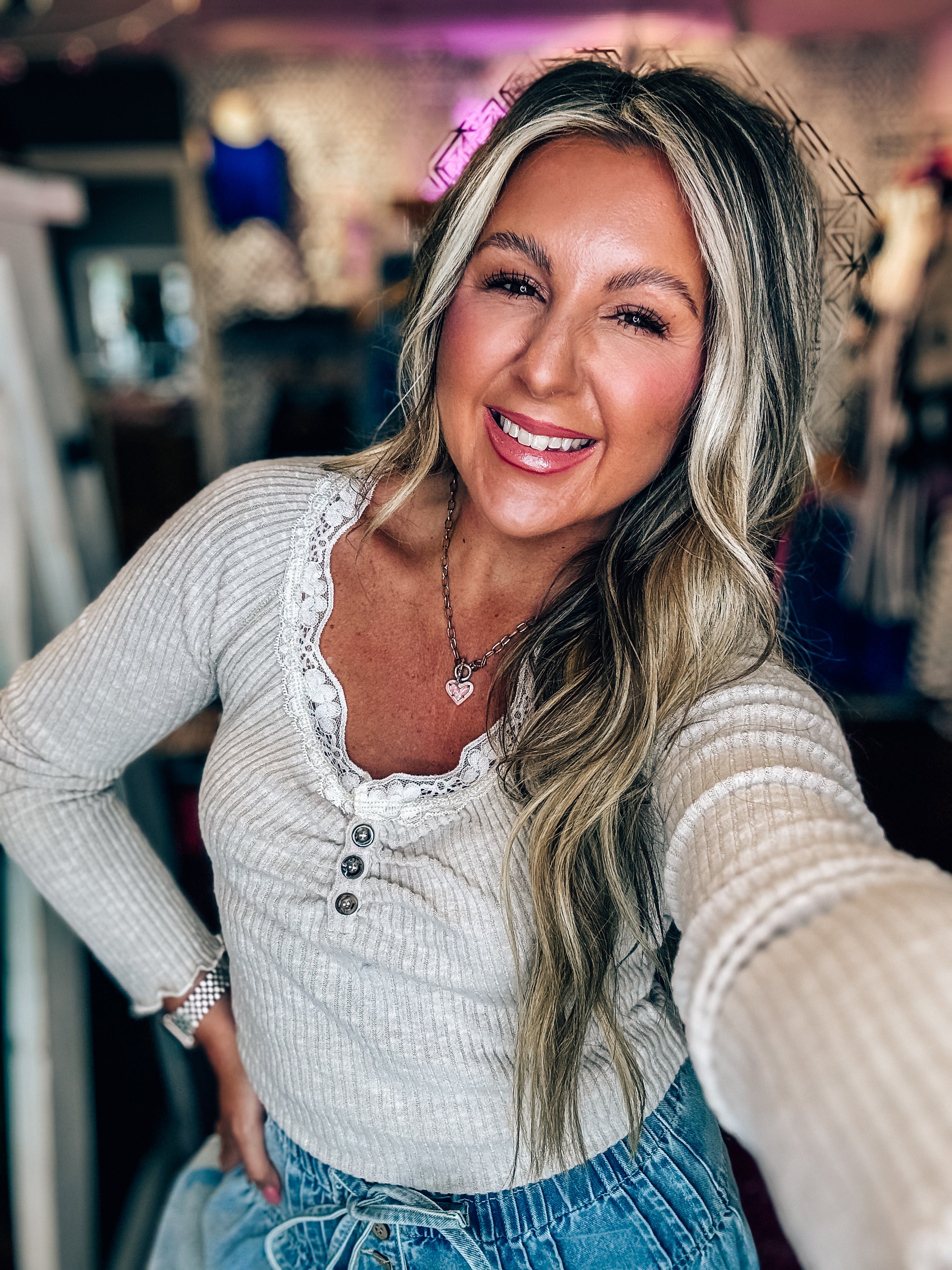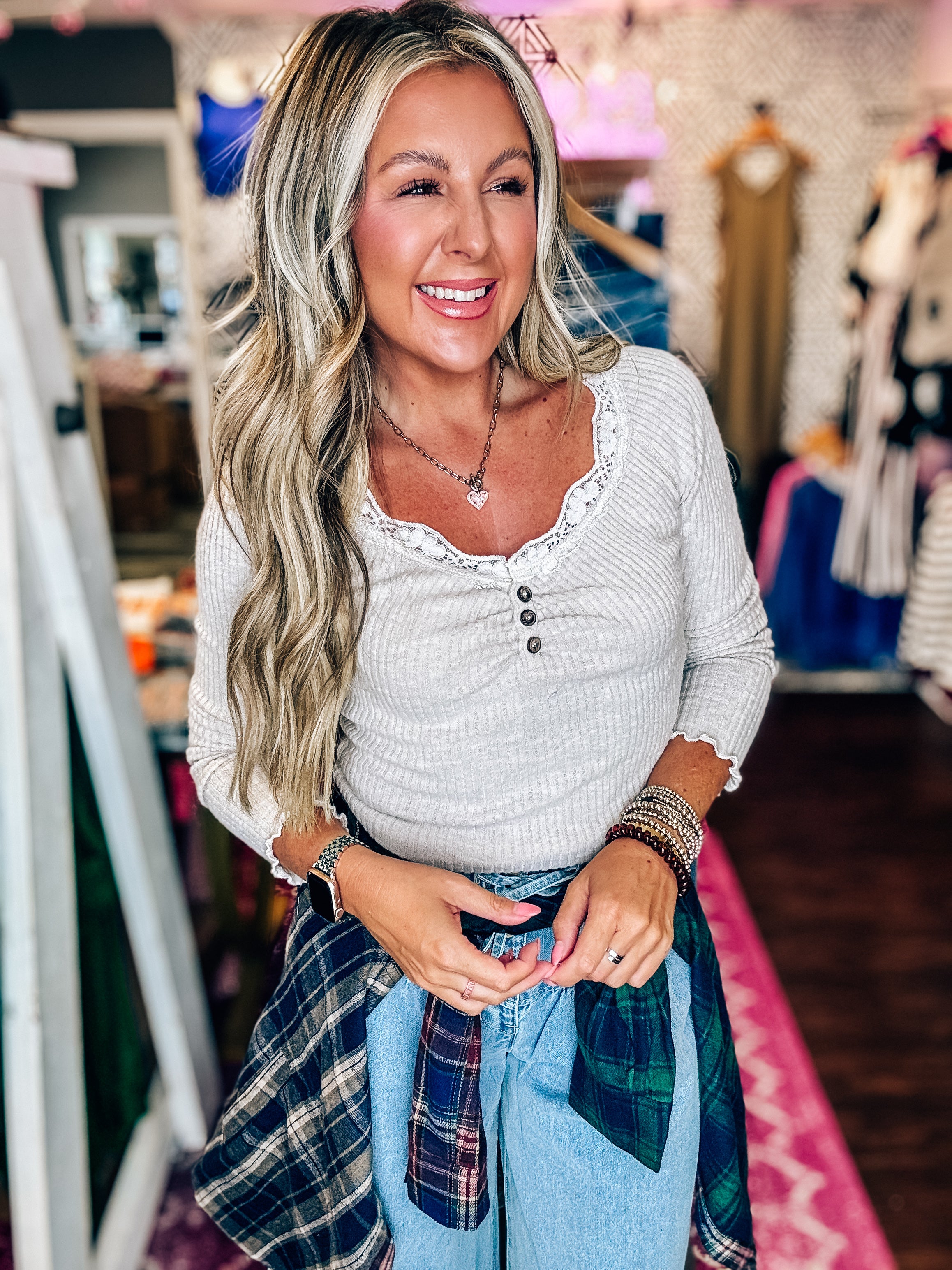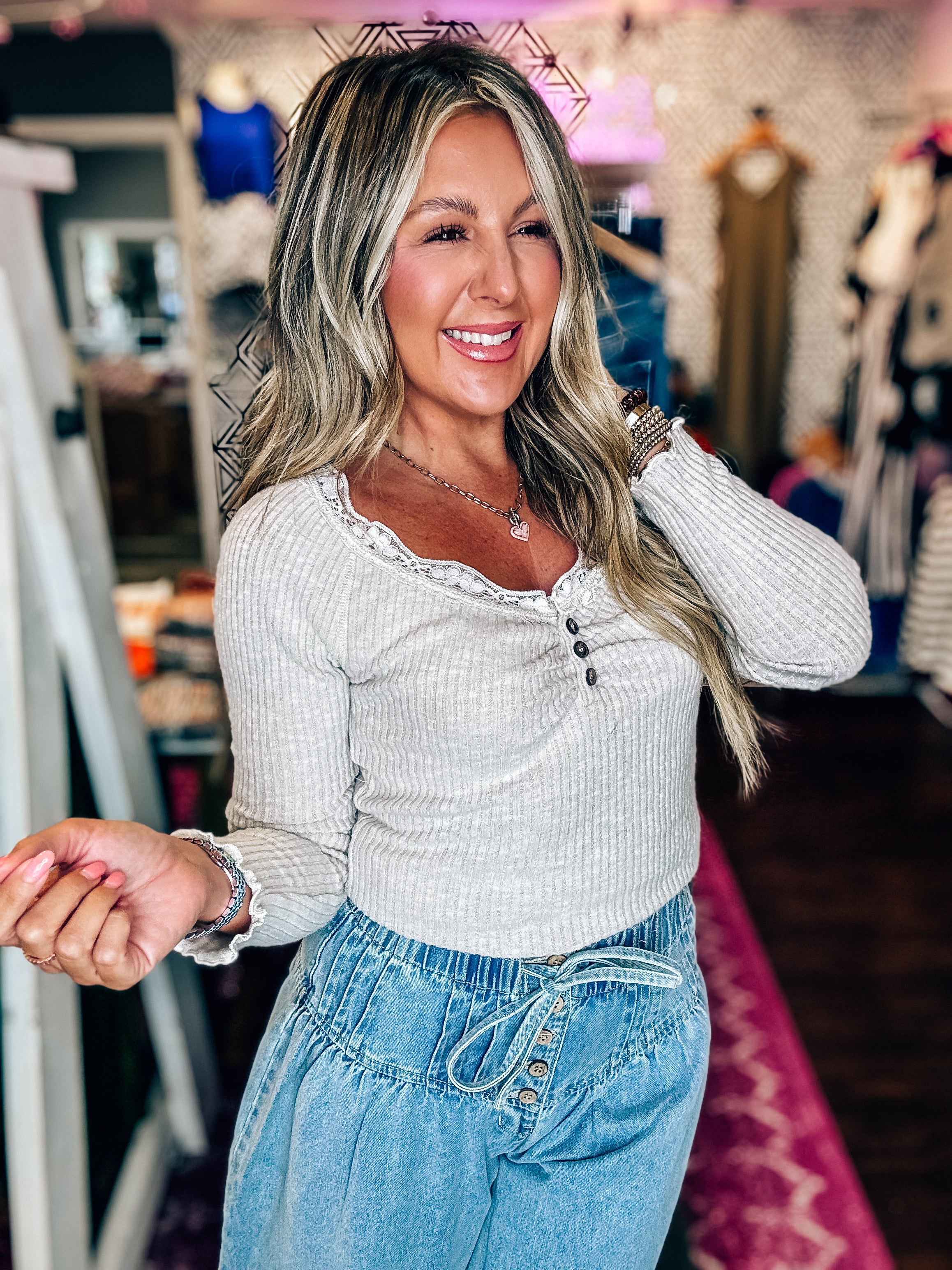 "Add some lace to your wardrobe with our Brushed Rib Henley top! This cozy top features a lace trim for a touch of femininity. Perfect for layering or wearing on its own, you'll love the soft and comfortable feel.