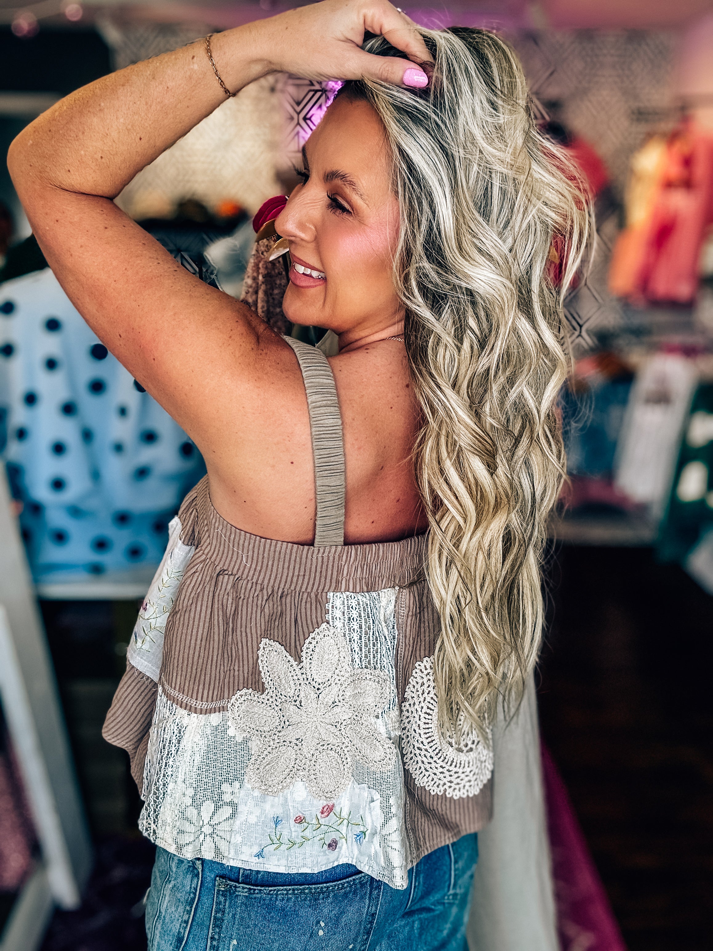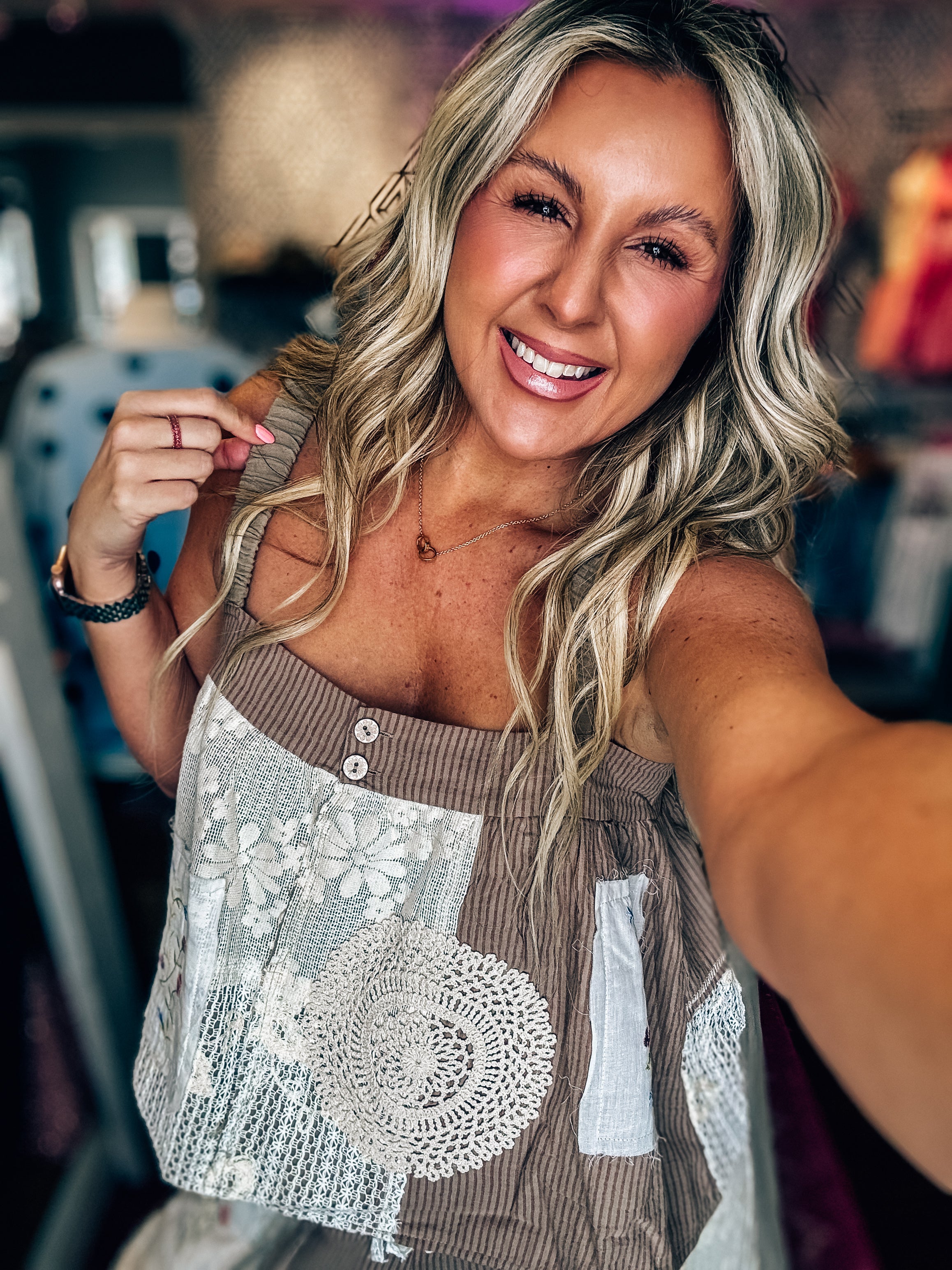 Rich lace, crochet, and patchwork details give this top standout character, while the airy A-line shape keeps it relaxed and flattering. The smocked back offers comfortable stretch, and the lightweight fabric moves with ease. Style it with the matching bottoms for a full statement look or keep it simple with denim.
