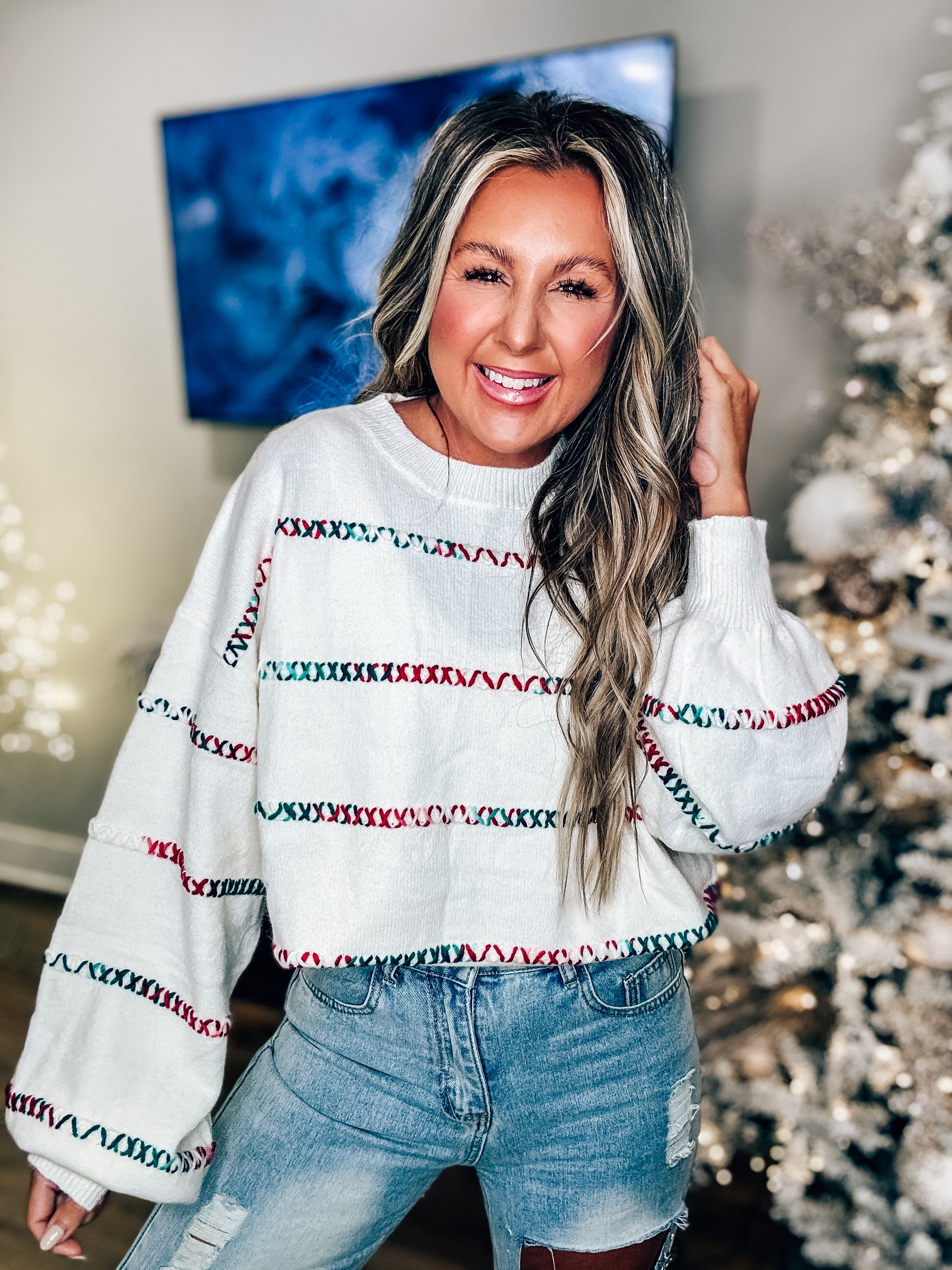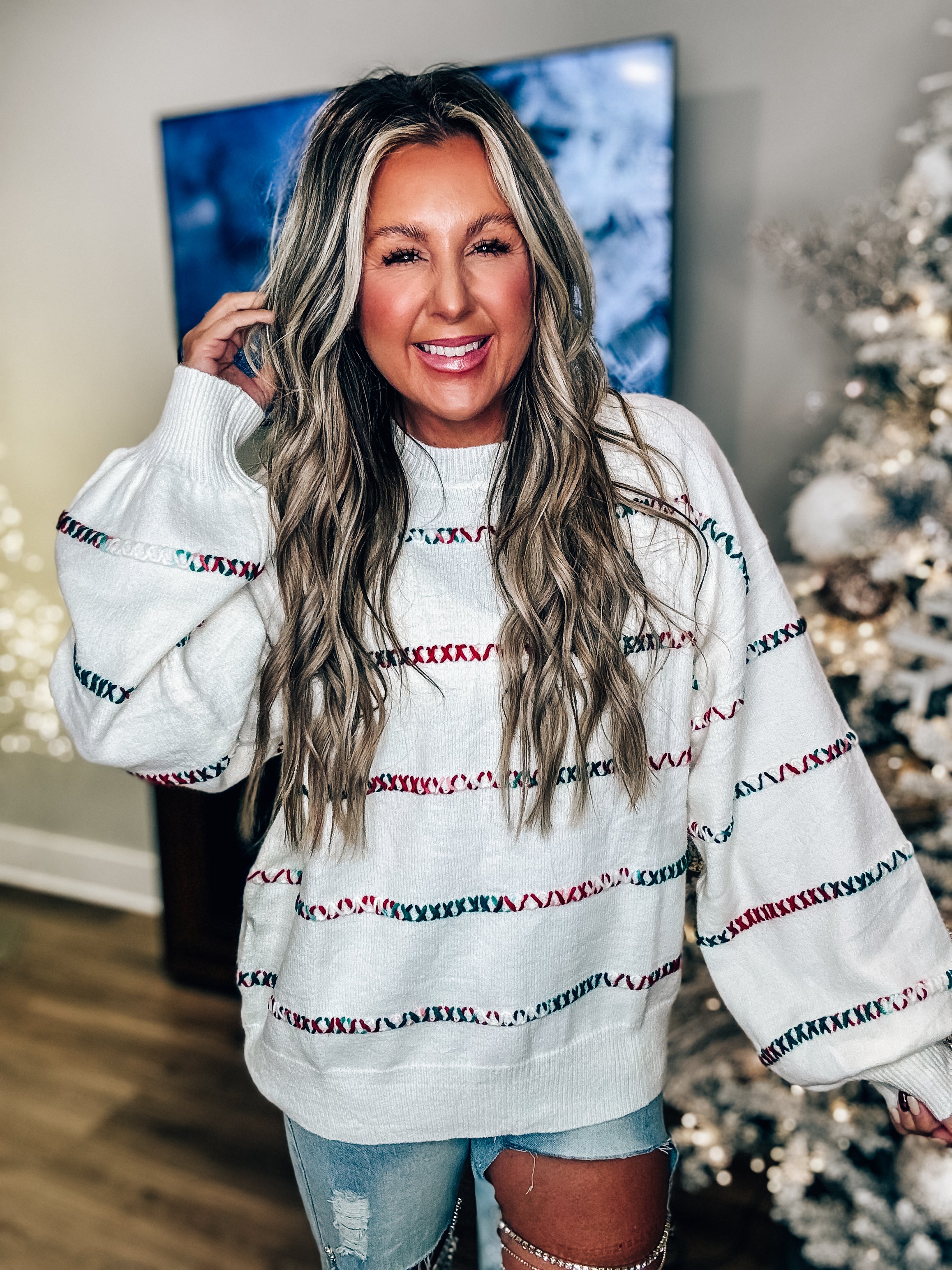 Add some festive flair to your wardrobe with our Red and Green Stitch Stripe Sweater! This soft and playful sweater features a bold red and green stitch stripe design, perfect for holiday parties or cozy nights in. Stay trendy and cozy this season with this unique sweater.