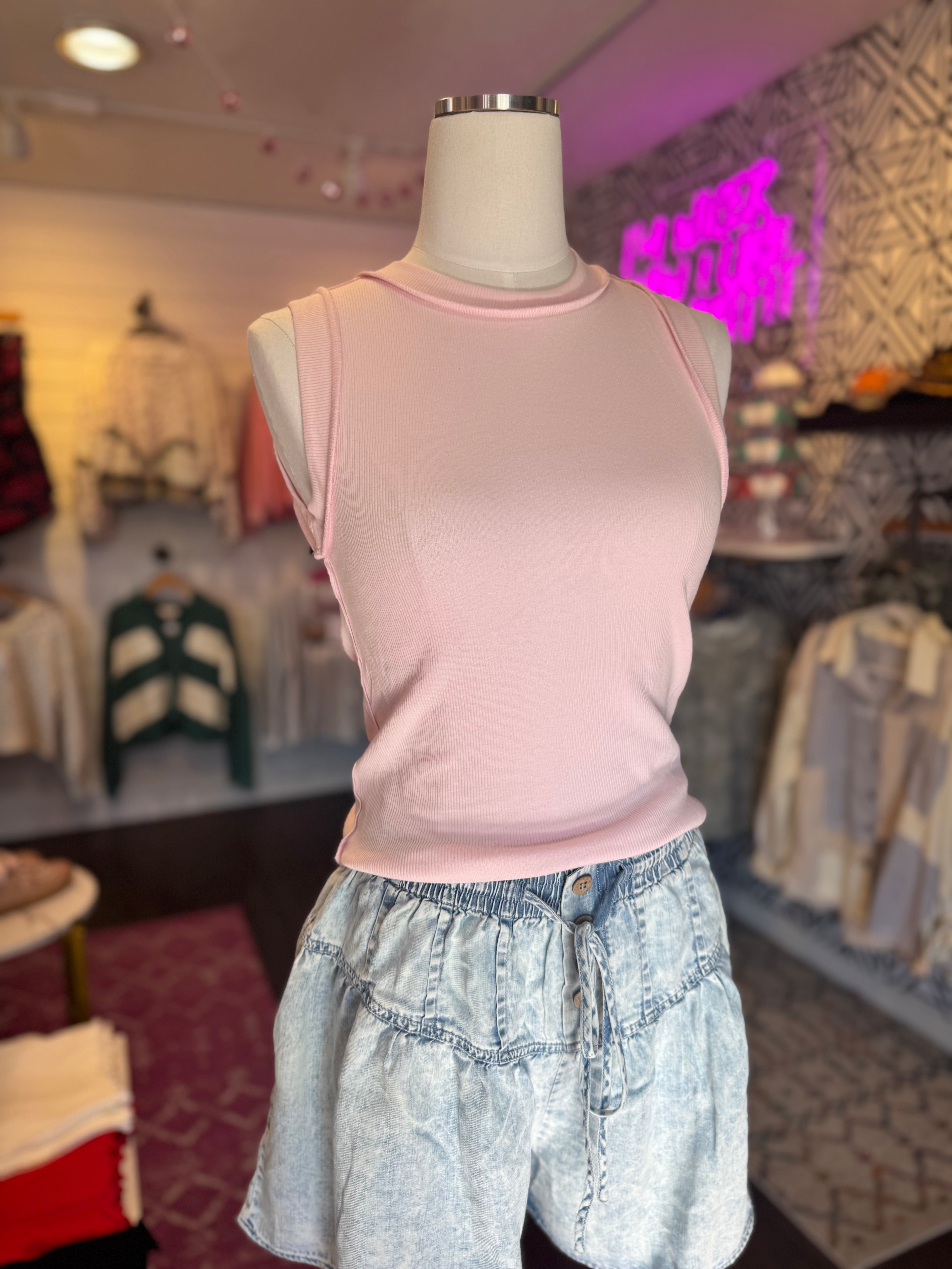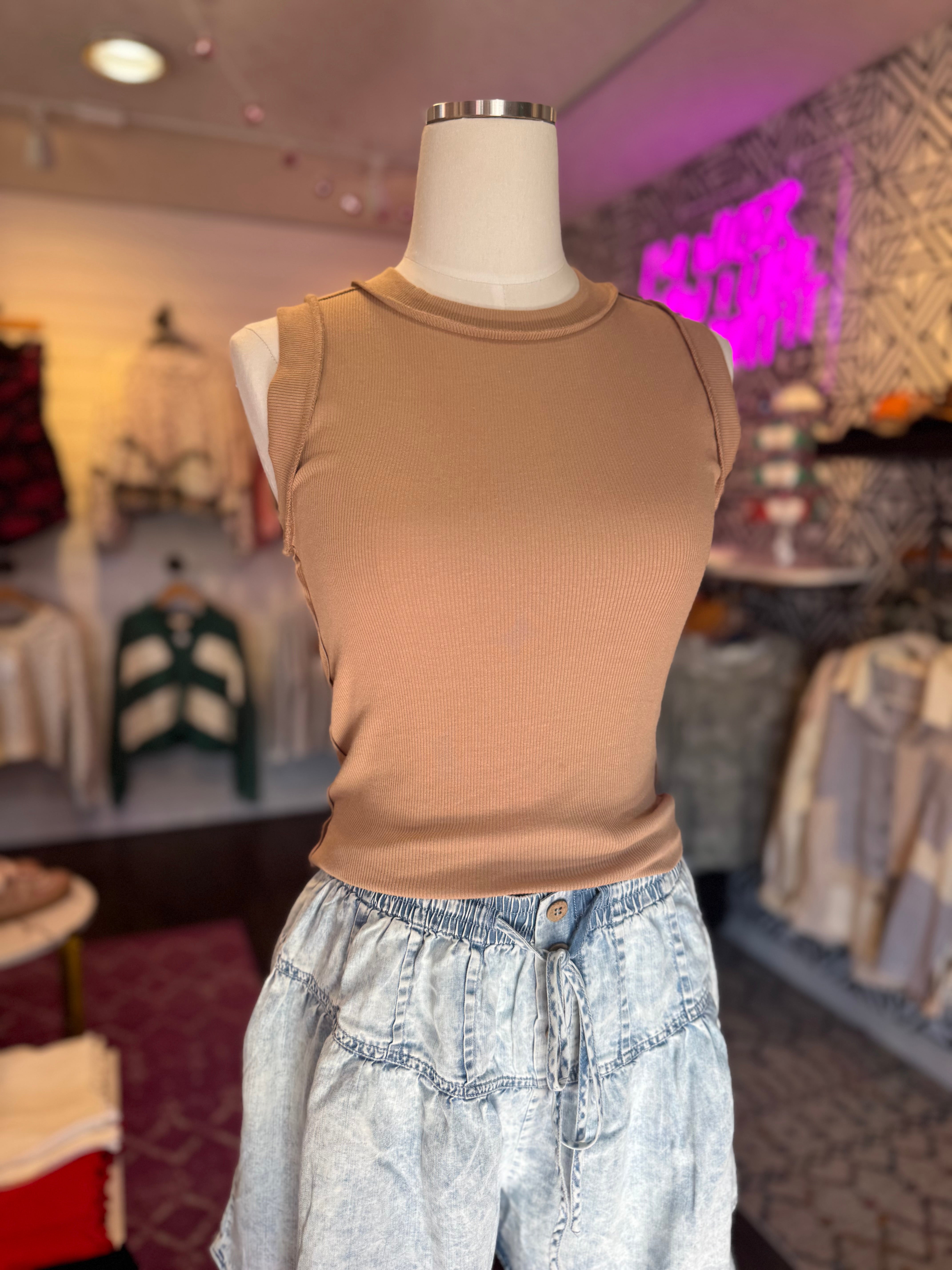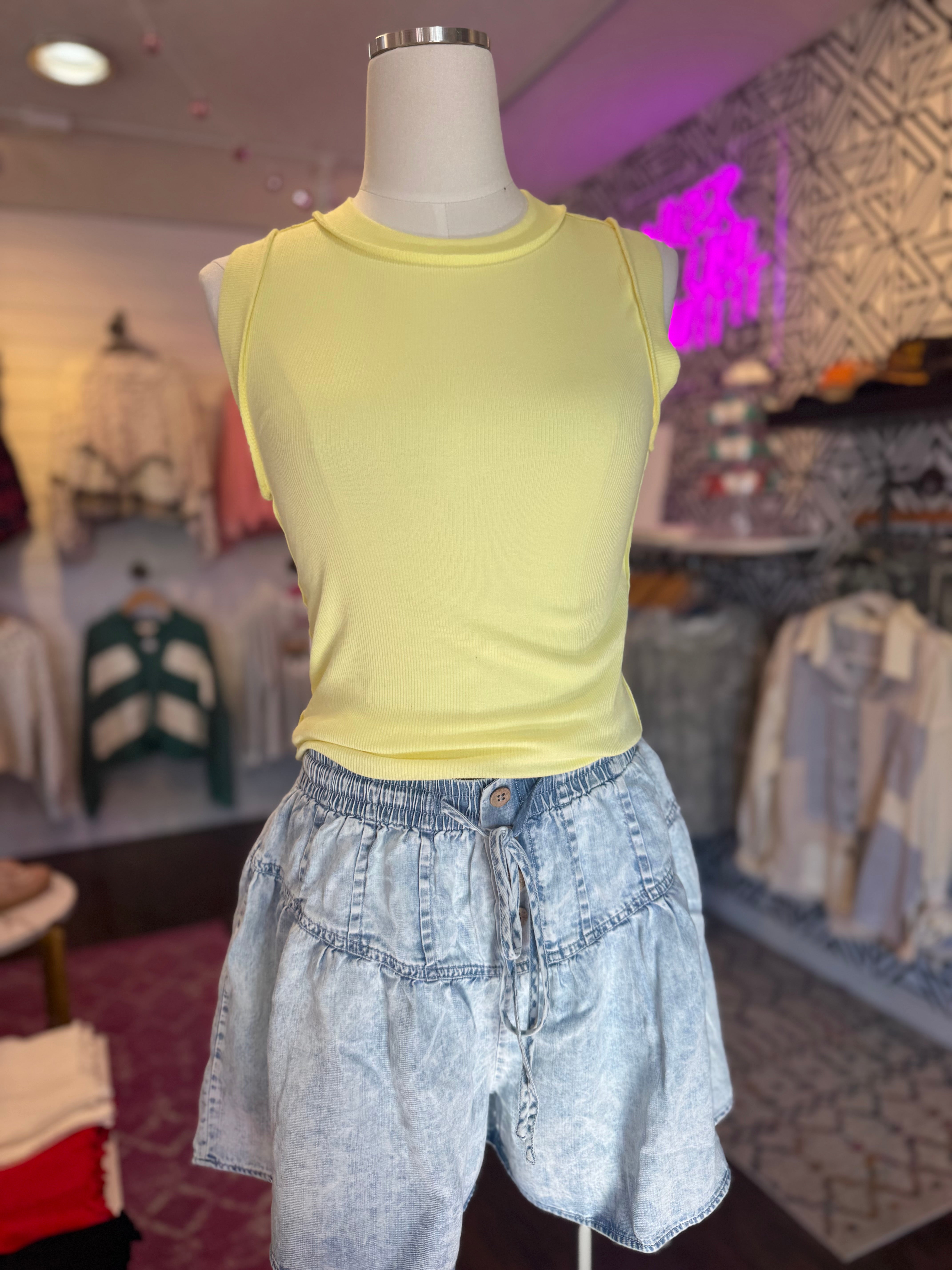Crafted from soft cotton-spandex ribbed knit, this foundational tank top offers comfortable stretch and texture. The design features a classic, high ribbed crew neckline and raw edge finish ribbed trim at the edges. Cut in a snug fit, the hemline is finished with a subtle curved shape. Pair with a denim skirt for a casual day out.