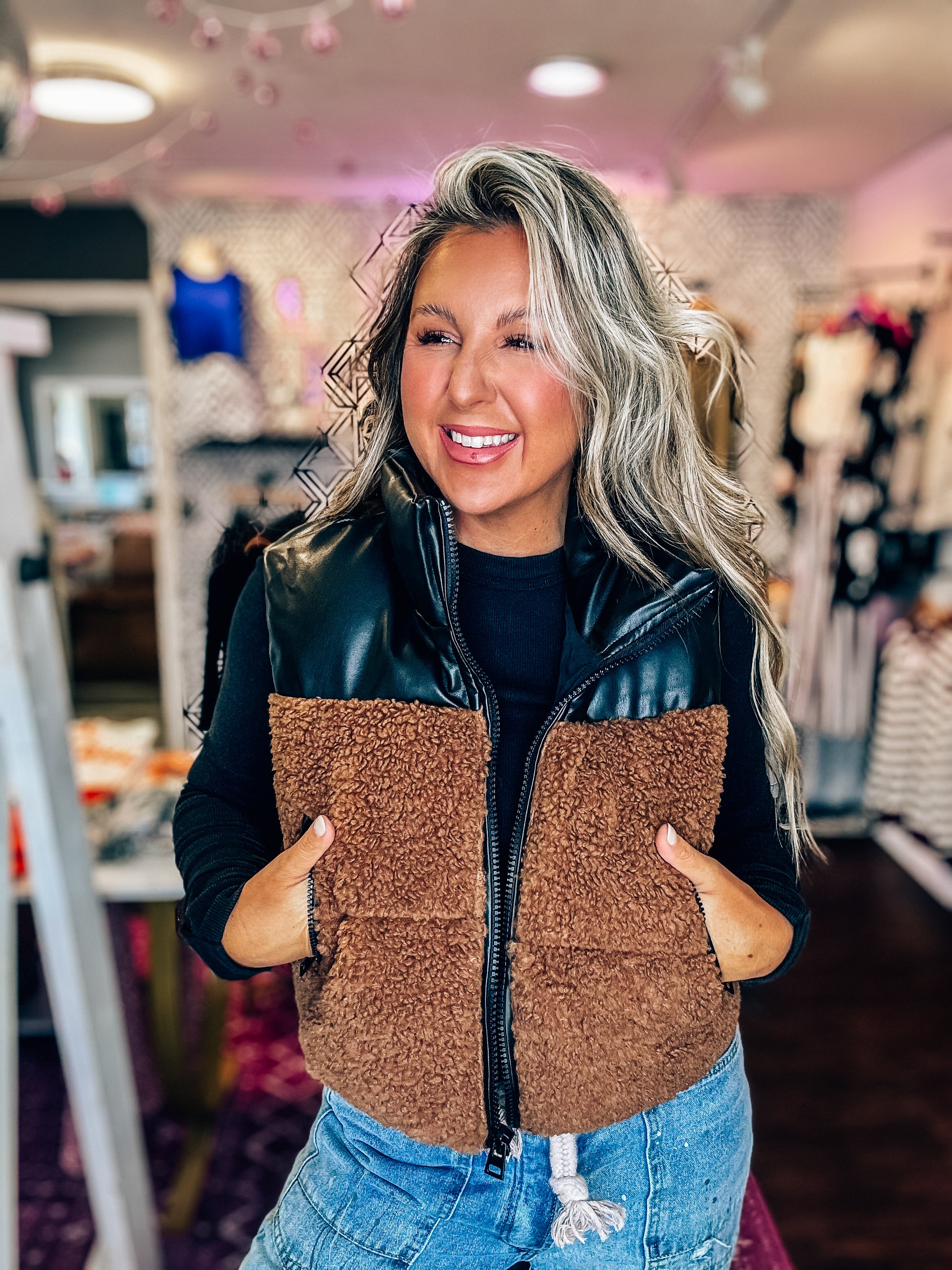 This chic puffer vest will leave everyone staring. It is made from contrasting PU and sherpa into a classic silhouette that lends warmth and style in one, featuring an oversized collar, front zipper closure and side slit pockets.