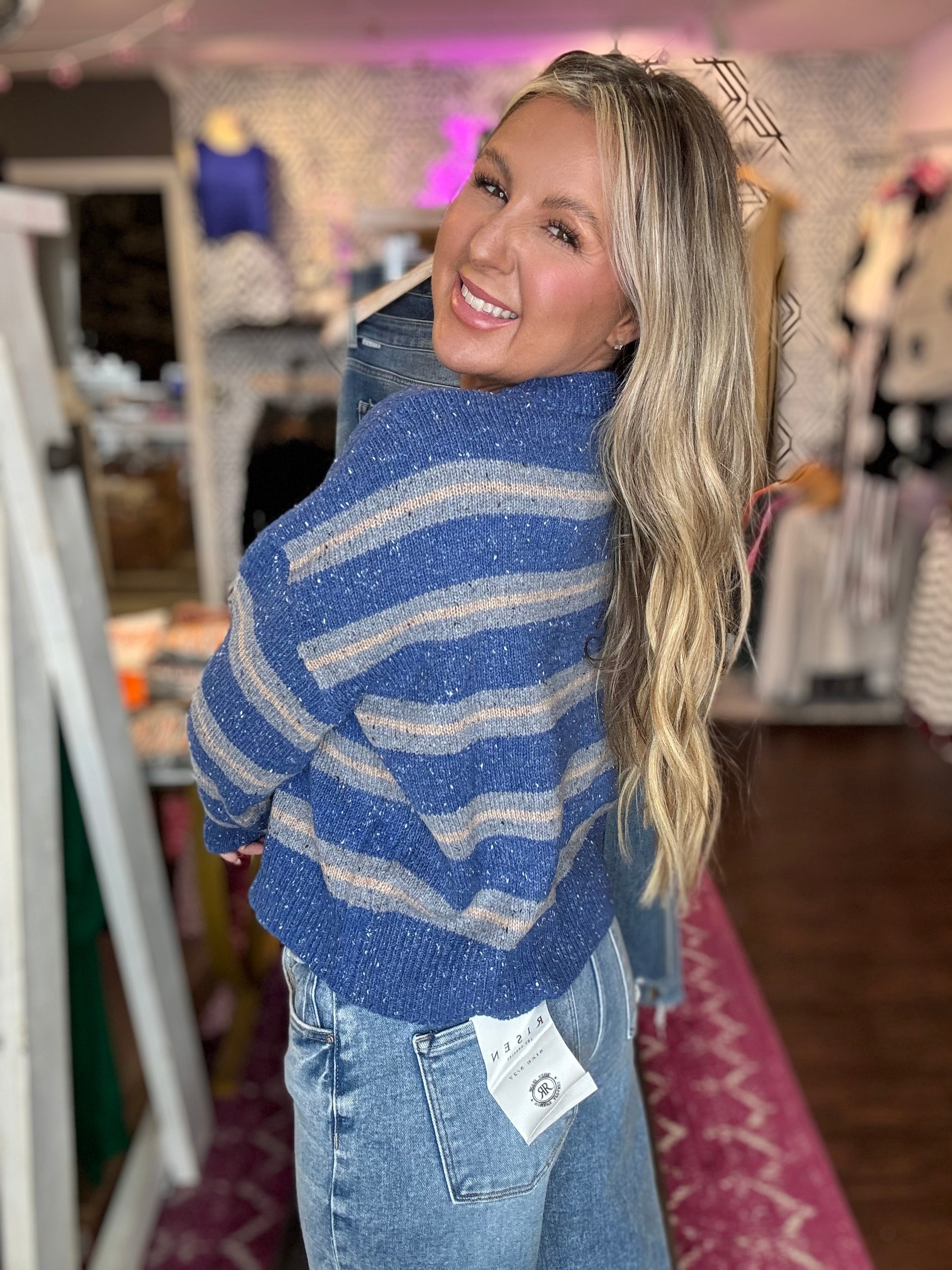 This sweater exudes a relaxed silhouette marked by horizontal stripe detailing, perfect for versatile styling. Its soft texture ensures comfort, making it ideal for layering during cooler months. Style with denim for a casual outing or pair with tailored trousers for a refined yet cozy ensemble.