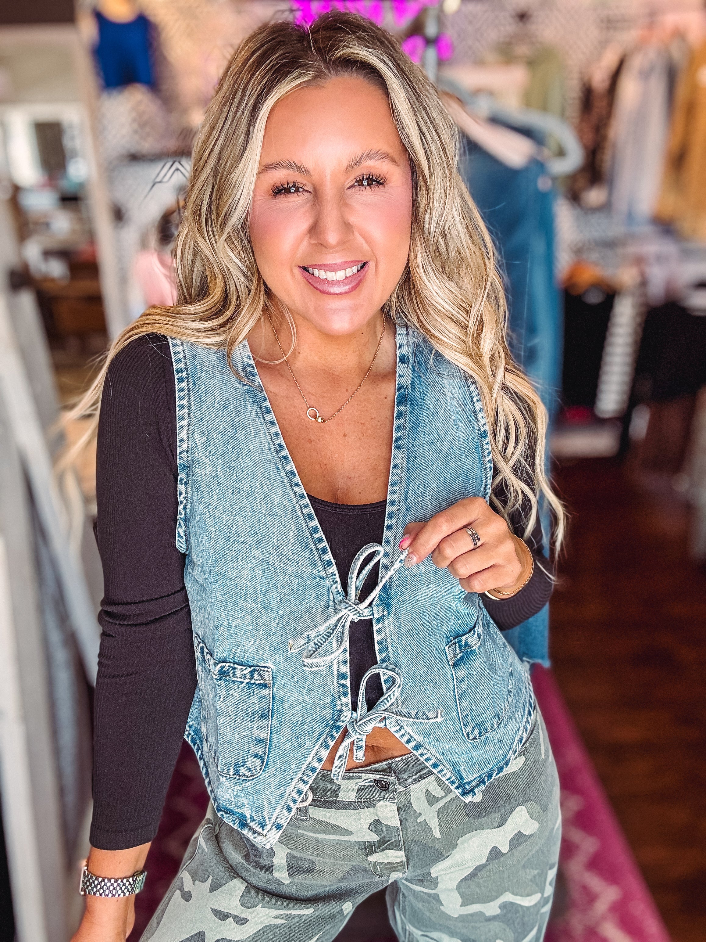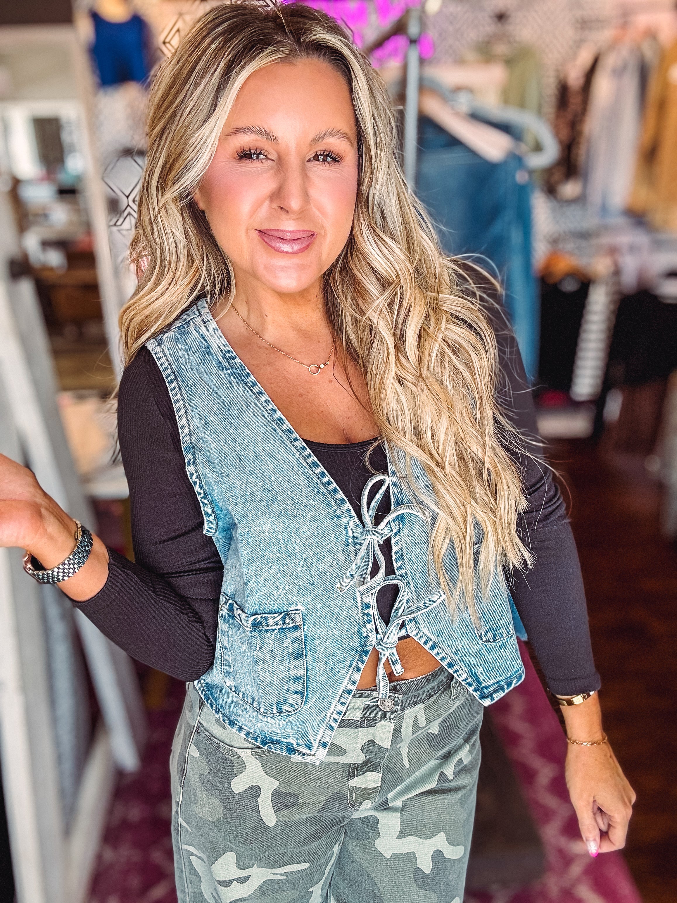 Elevate your wardrobe with our Denim Front Tie Vest! A versatile v-neck silhouette and crop length add a touch of edginess to any look. Plus, convenient front pockets provide practicality without sacrificing style. Complete your outfit with this must-have piece!