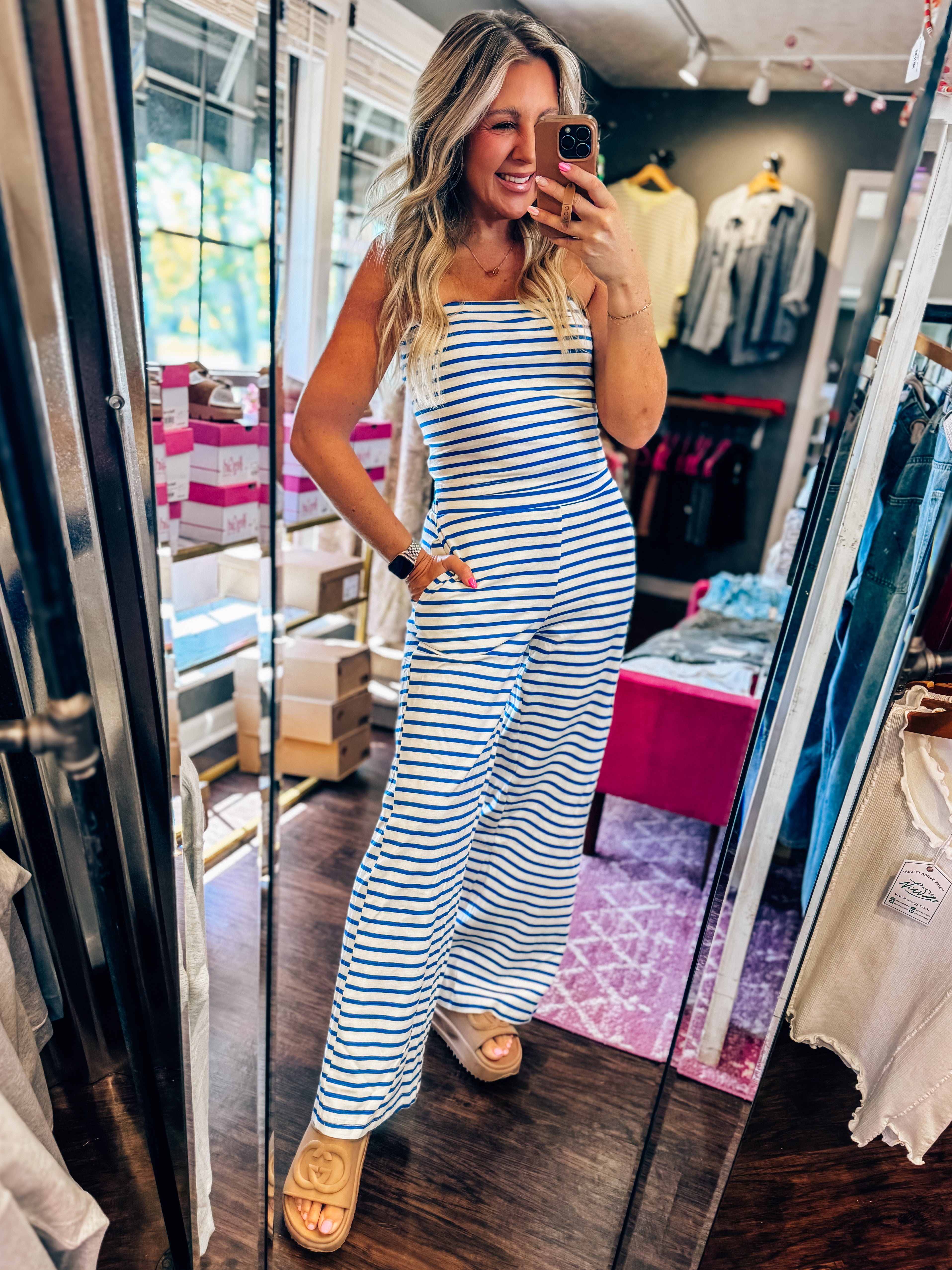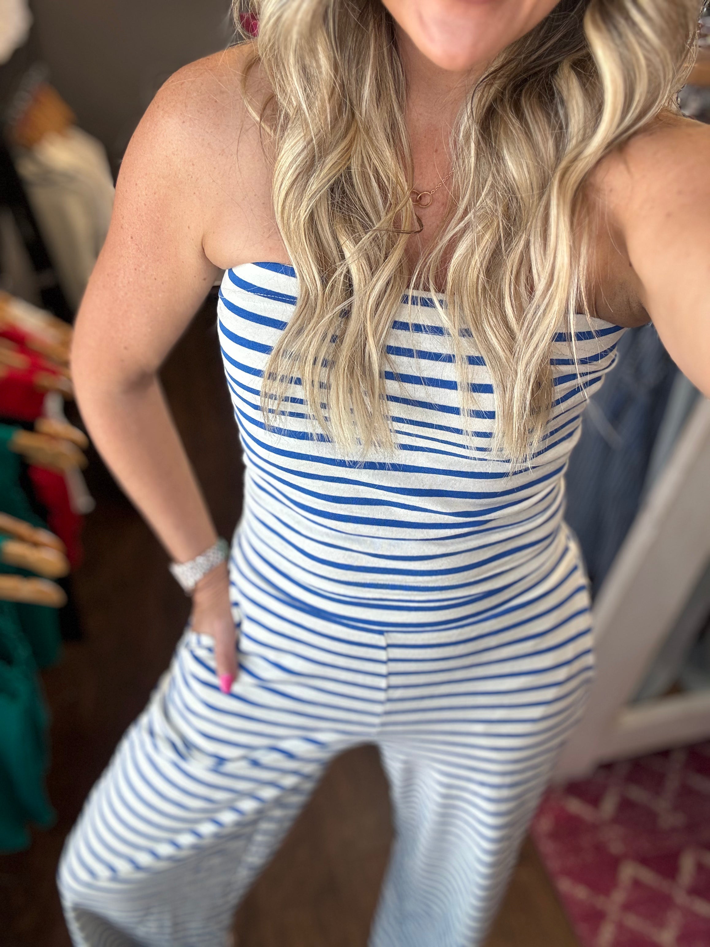 This black and white striped set is the definition of easy style with a polished feel. Featuring a strapless, straight-across neckline, the top offers a flattering, stay-put fit while keeping things sleek and minimal. The matching high-waisted pants flow into a relaxed, wide-leg silhouette that elongates the legs and moves beautifully with you.