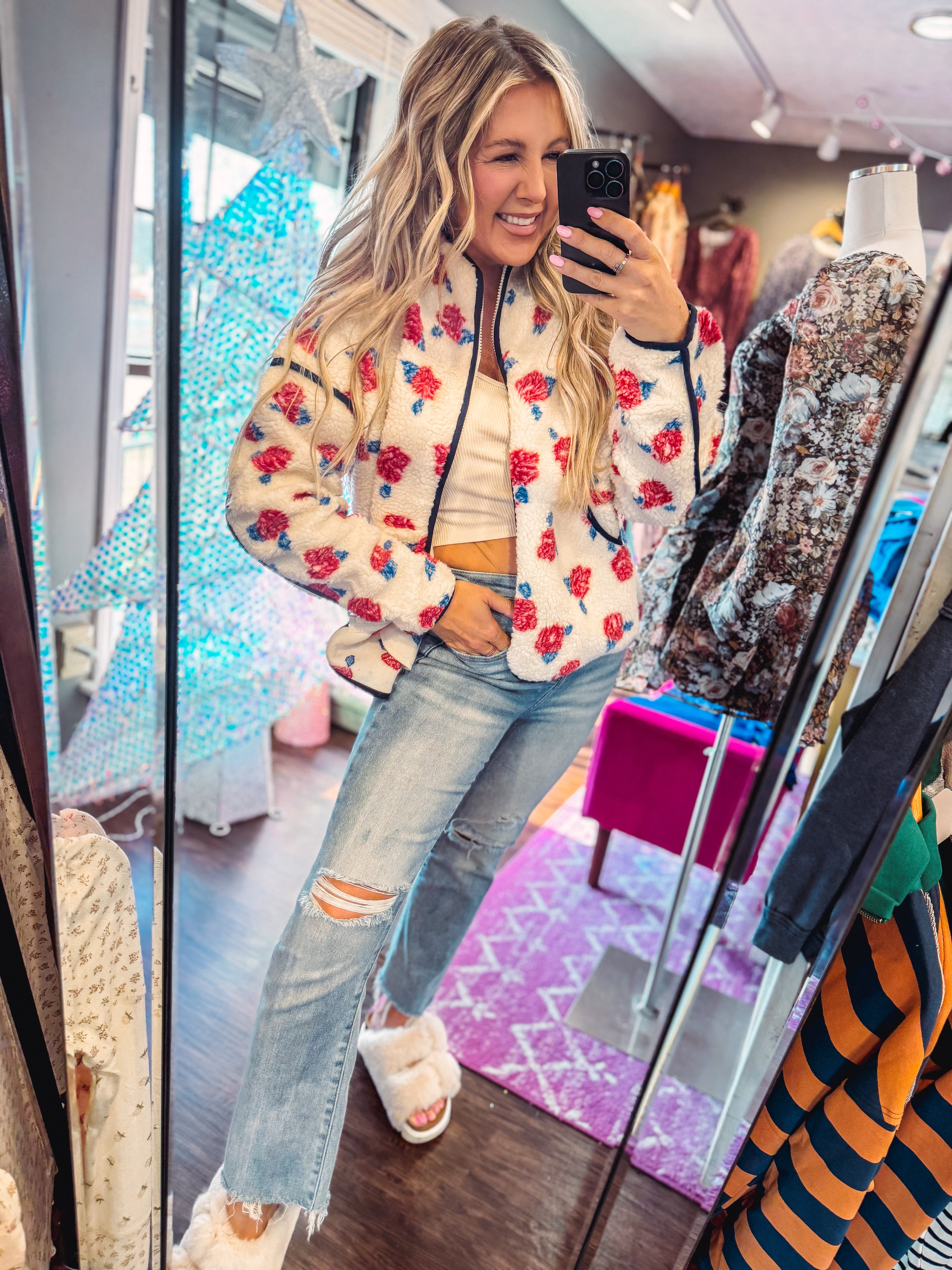 Oversized Floral Printed Fleece Sherpa Jacket