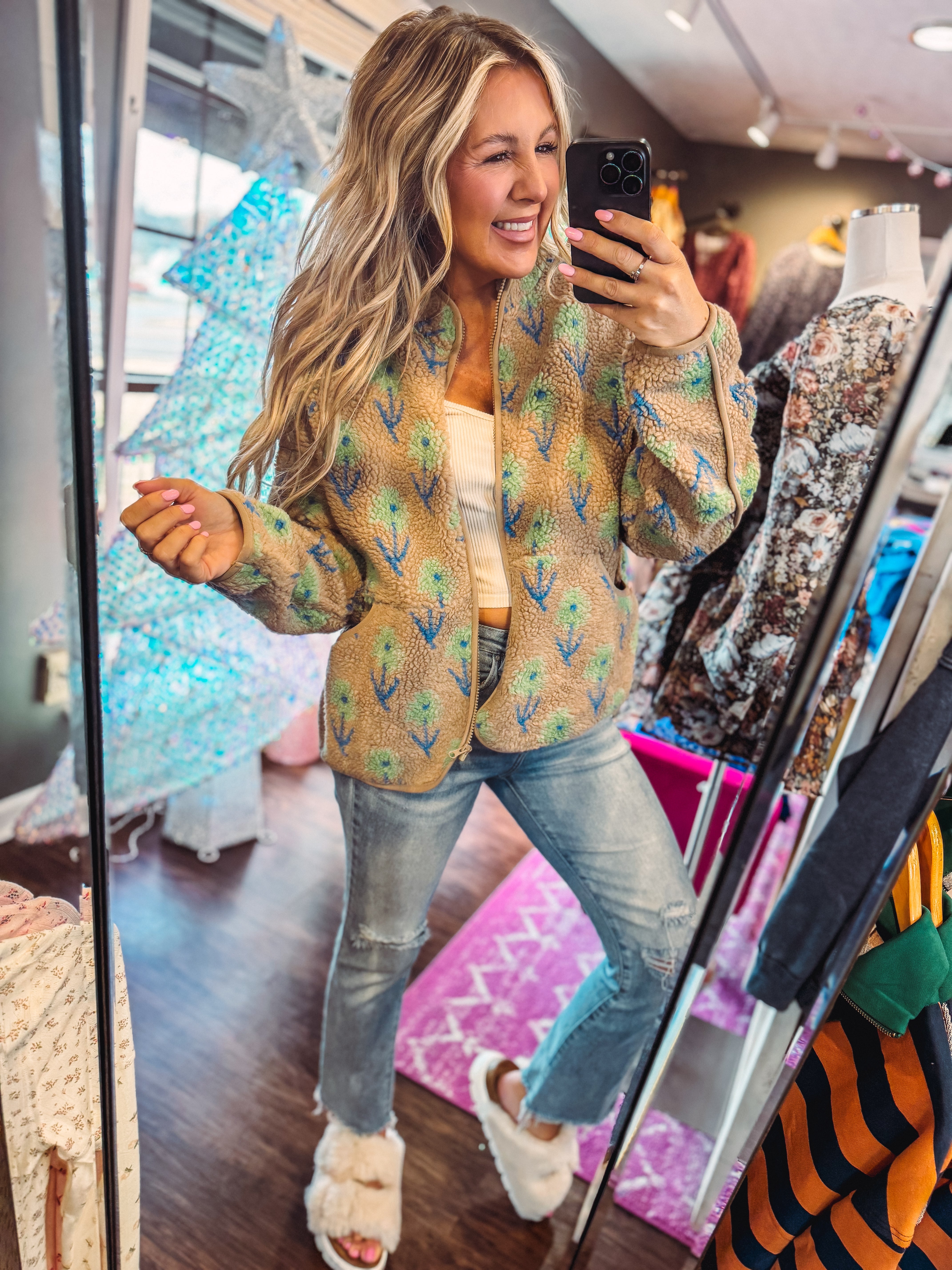 Oversized Floral Printed Fleece Sherpa Jacket-Mocha