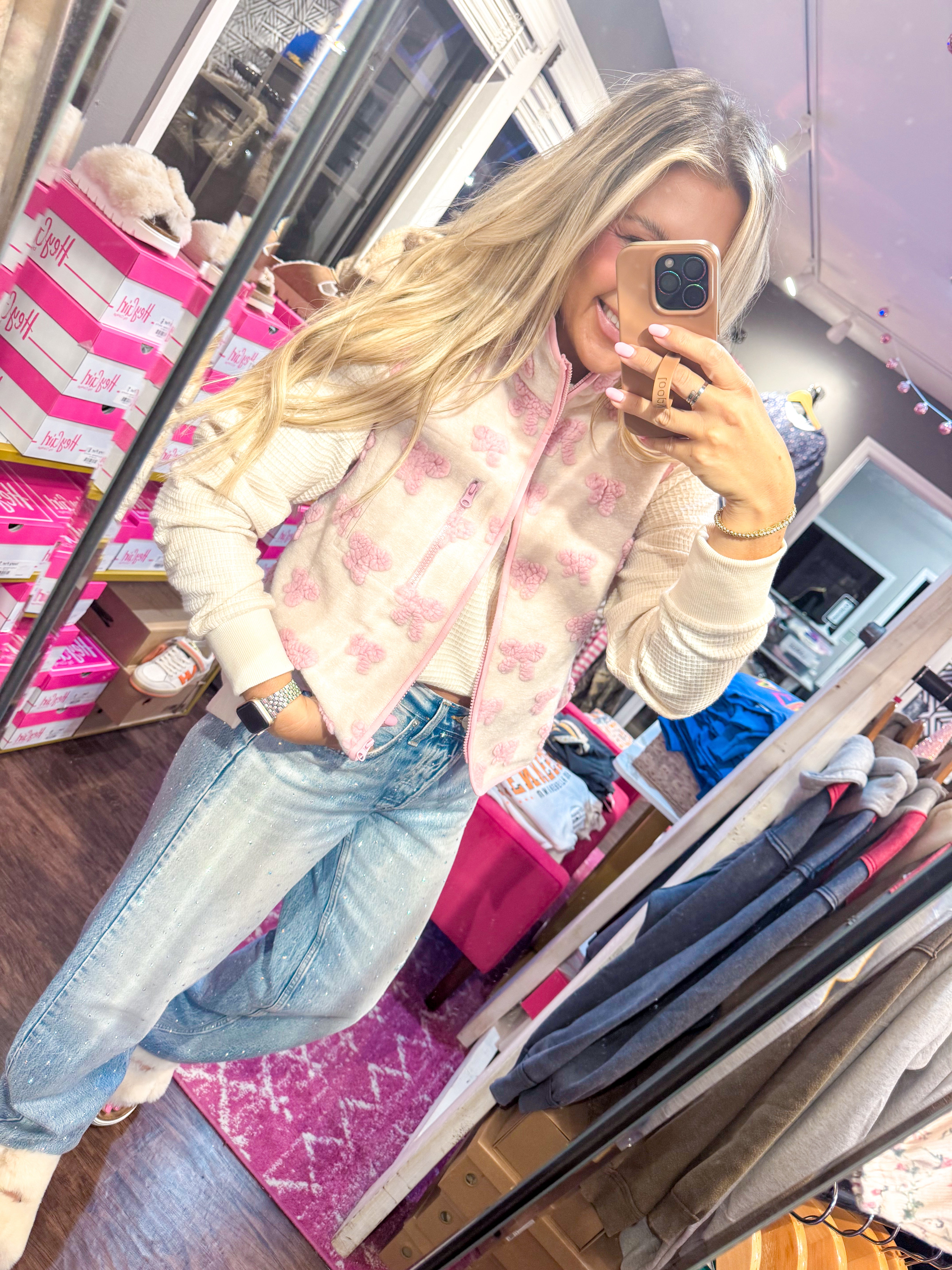 Pink Textured Bow & Floral Printed Vest